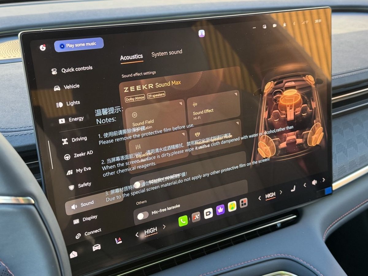 · Концертный зал на колесах: Аудиосистема ZEEKR Sound Max с 29 динамиками, 8 сабвуферами в сиденьях и мощностью 4680 Вт поддерживает звук Dolby Atmos.